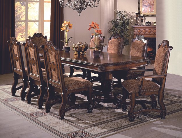 Elevate your dining space with the timeless elegance and grandeur of this exquisitely crafted dining group. Featuring a beautifully carved table with intricate detailing and a stately double pedestal base, this set exudes classic European-inspired charm. The richly upholstered chairs provide luxurious comfort, boasting ornate wooden frames with scrollwork accents that add to the regal aesthetic. Designed for those who appreciate fine craftsmanship and sophistication, this set transforms any dining room into a space fit for lavish gatherings and unforgettable meals.