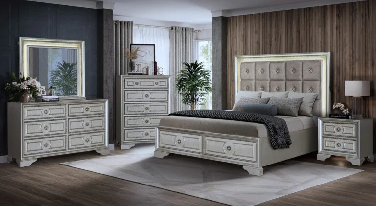 King or Queen Bedroom Set. Drawer do not open. Night Stand has 3 in 1 charging station. LED Lighting on the headboard and mirror.