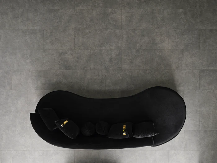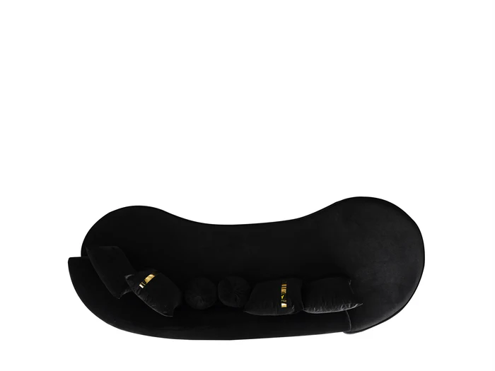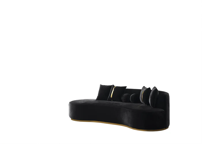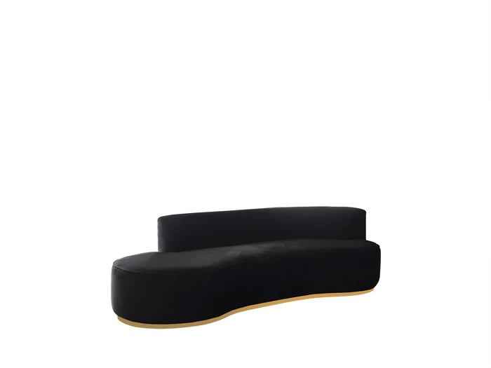Ella Black Chaise Lounge is a stunning addition to your living space that effortlessly blends sophistication and modernism.The chaise lounge boasts a unique curved design. The black velvet color of Ella, exhibits sophistication and refinement. The bottom of the chaise lounge features a striking gold detail, adding a touch of opulence and glamour. The item comes with four square pillows and two round pillow.