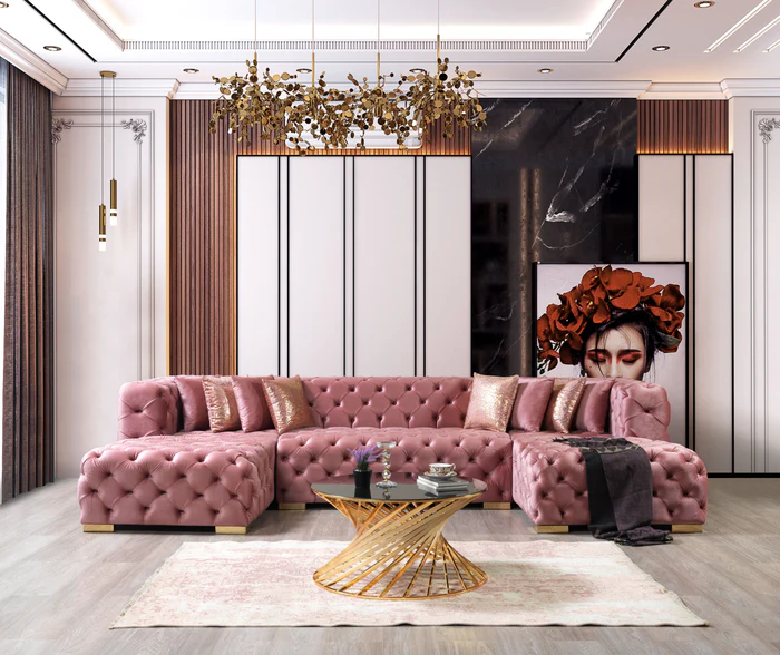 Neva Sectional embodies luxury and elegance, designed to be the focal point of any room. Fully tufted and handcrafted with meticulous attention to detail, this sectional showcases unique craftsmanship. The rich velvet fabric adds a touch of opulence, creating a sumptuous feel and a sophisticated look. Perfect for lounging in style, this sectional combines comfort and sophistication in one stunning package.